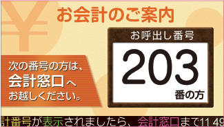 呼出表示モニターに受付番号が表示され、音声でアナウンスが流れます。
